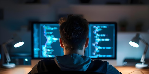 Coder gericht op de computer in een gezellig kantoor thuis ondergedompeld in programmeren Concept Coding Computer Programming Home Office Tech Focus Gezellige werkruimte
