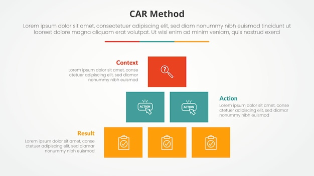 CAR interview model infographic concept for slide presentation with box rectangle pyramid structure with 3 point list with flat style